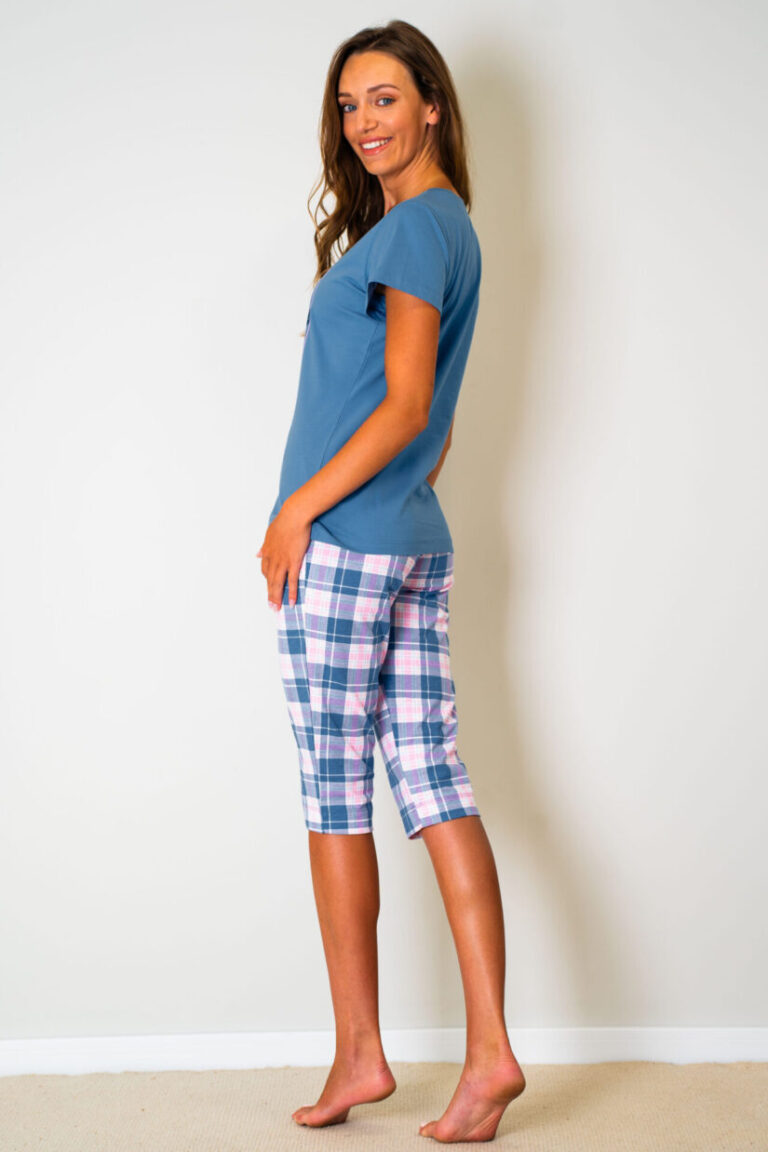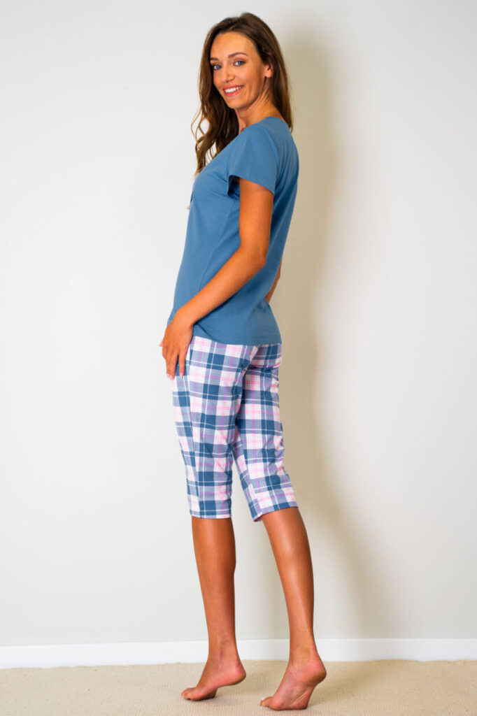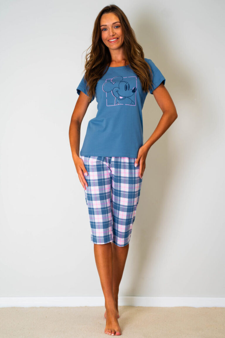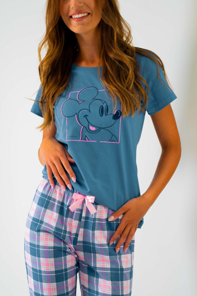 Piżama damska MYSZKA MIKI spodnie 3/4 w kratę, to wygodny i elegancki komplet do spania.. W skład kompletu wchodzi koszulka na krótki rękawek, z okrągłym dekoltem. Koszula w kolorze niebieskim z nadrukiem Myszki Miki. Nadruk nawiązujący do wzoru na spodniach doskonale komponuje się z kobiecym stylem piżamki. Spodnie w kratkę. Całość została uzupełniona delikatną czarną kokardką na spodniach, spodnie w pasie mają gumę.